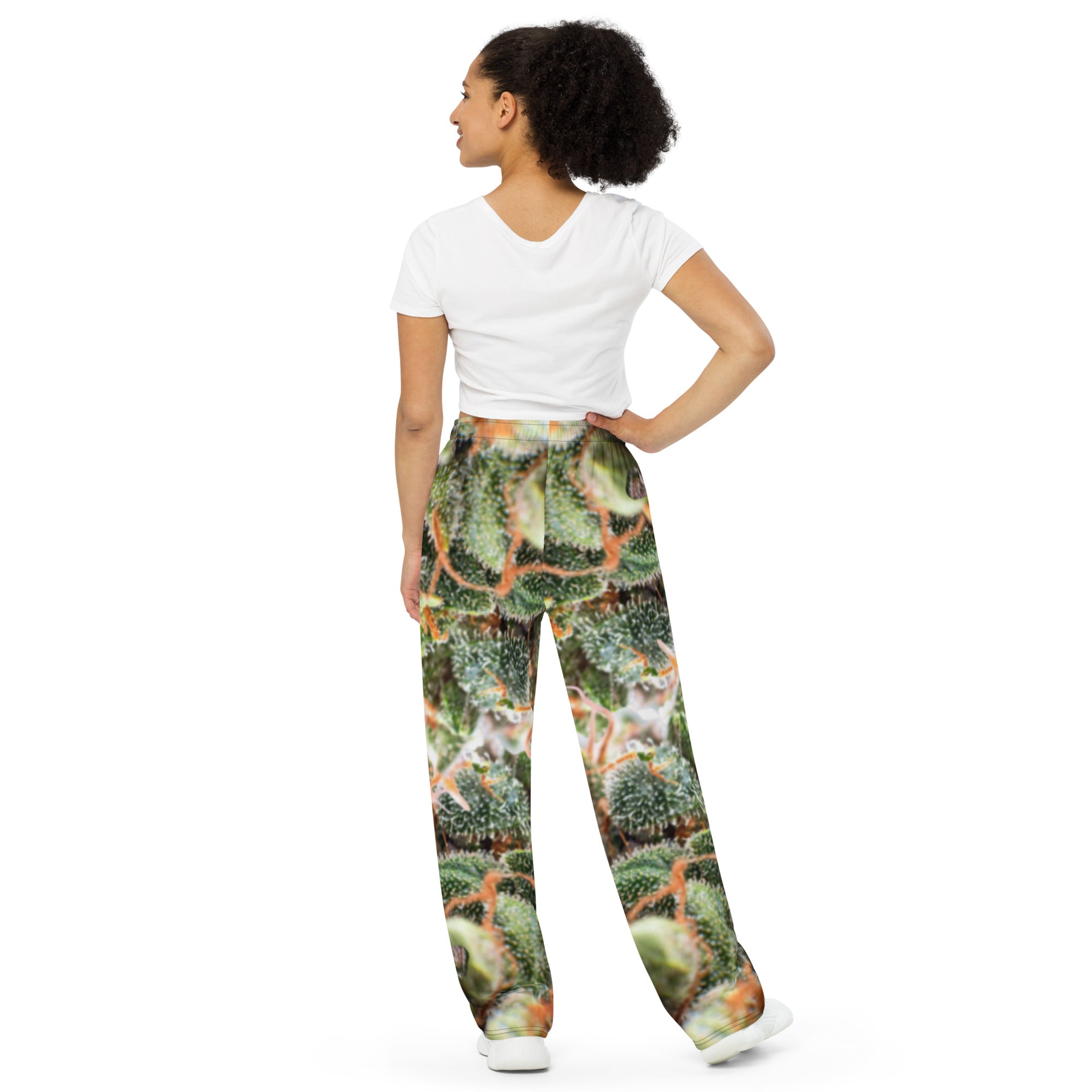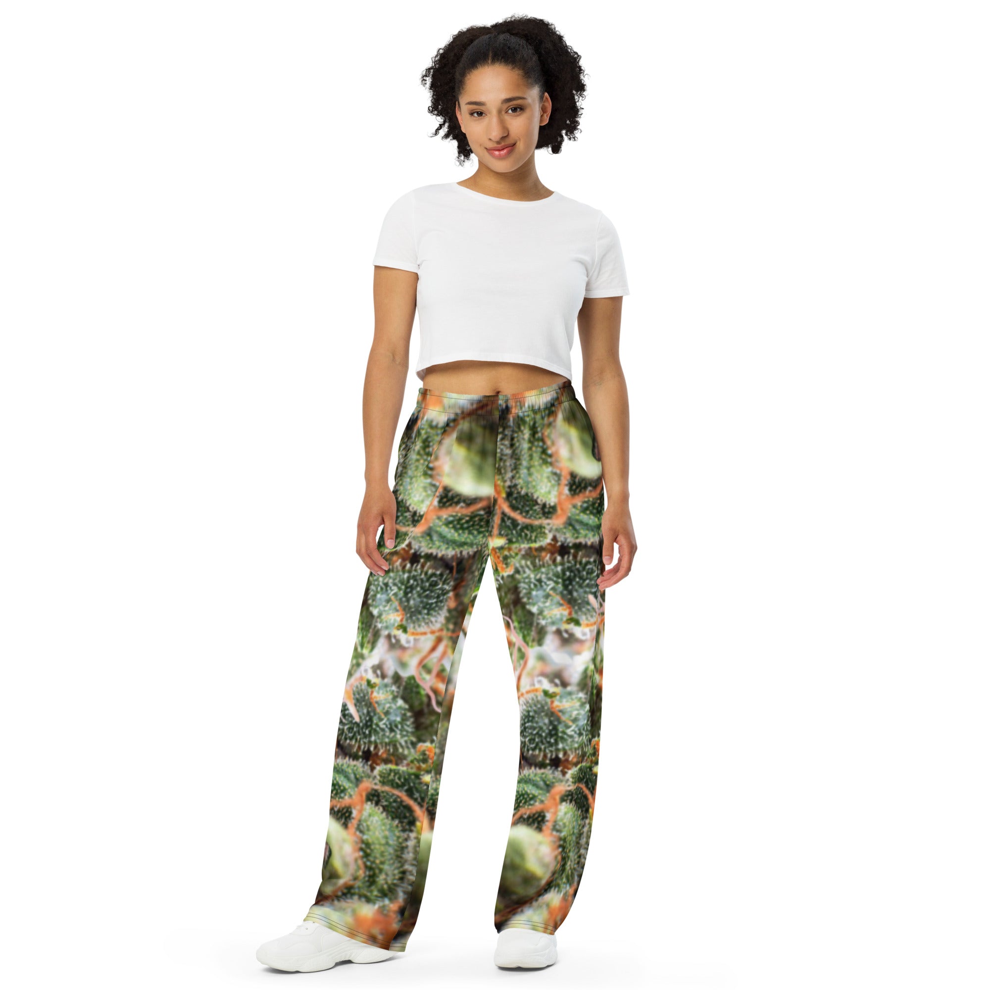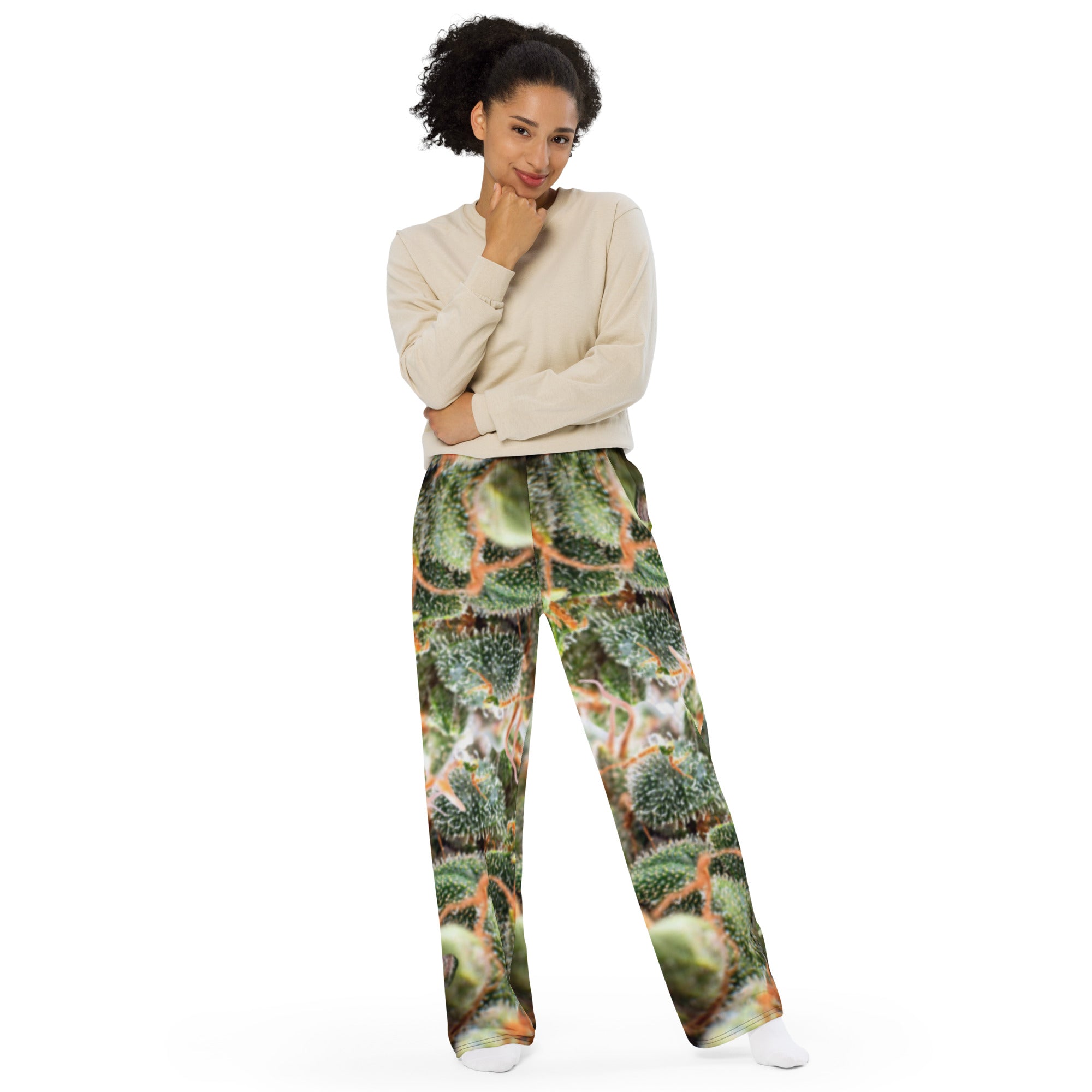 *Real cannabis trichome photography wide-leg pants, marijuana growth state imagery, free shipping comfort*
