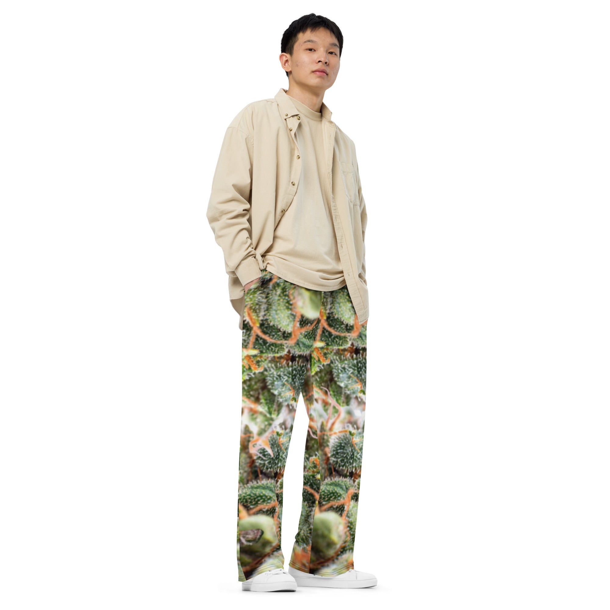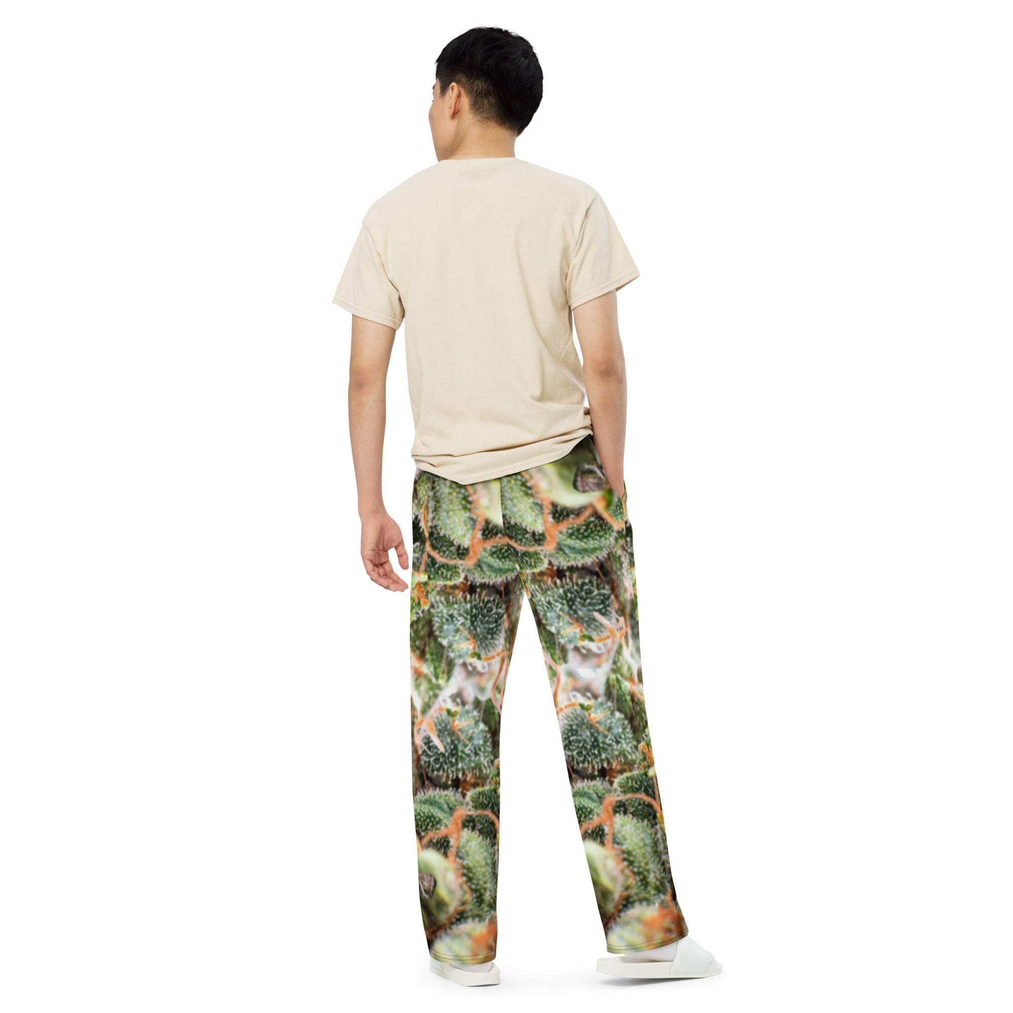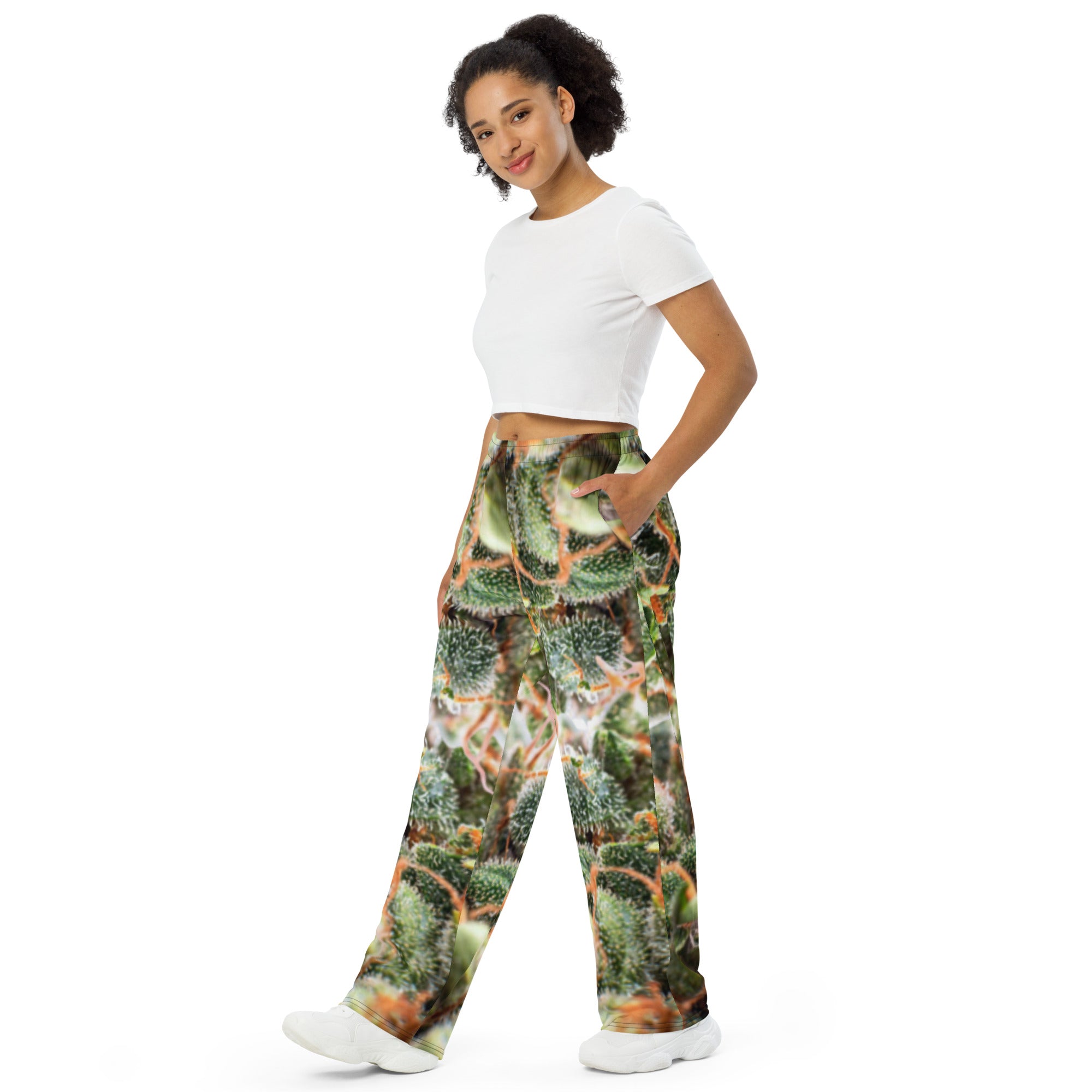 *Real cannabis trichome photography wide-leg pants, marijuana growth state imagery, free shipping comfort*