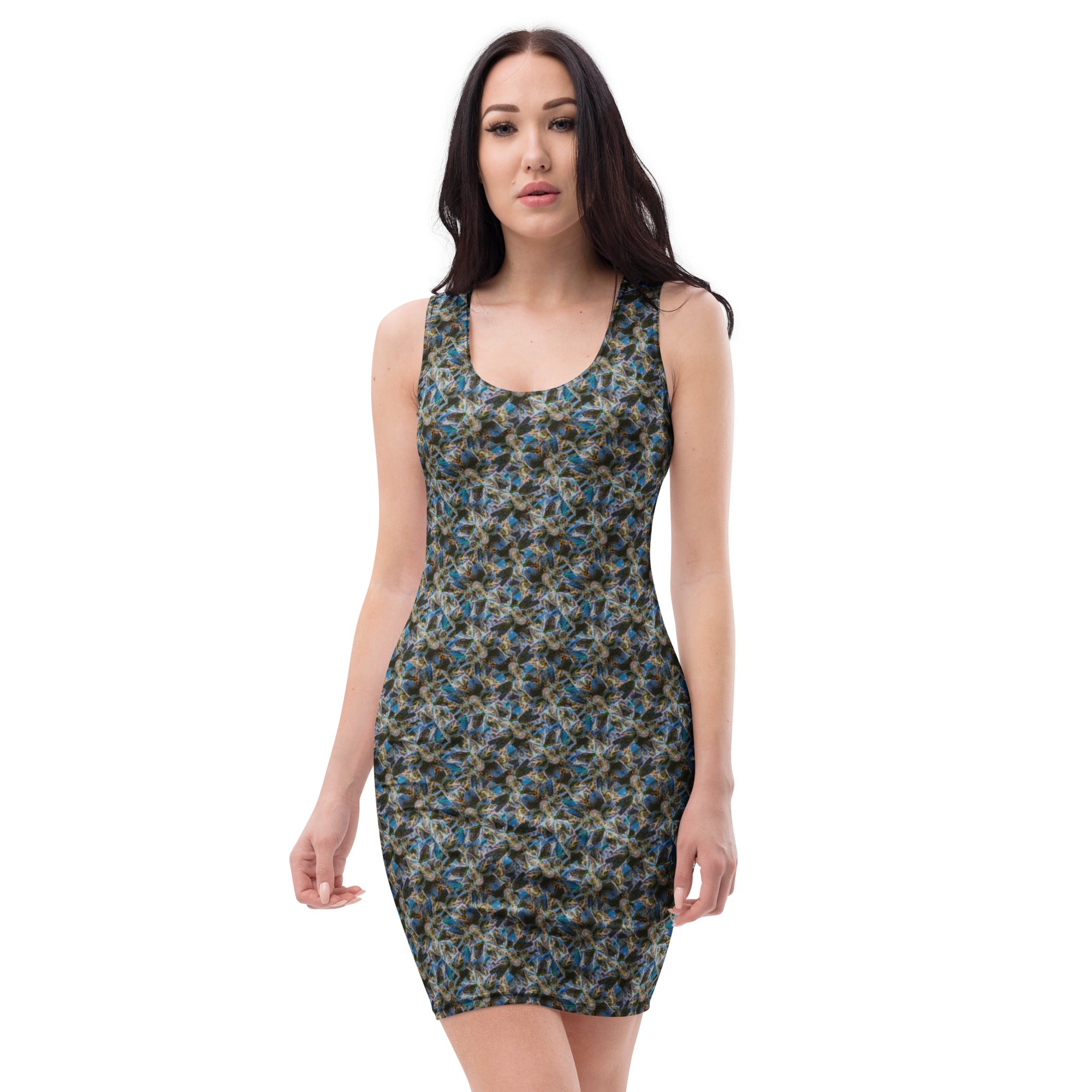 Make a stunning botanical statement as a couple OR shine brilliantly on your own! This captivating all-over printed bodycon dress features the exact same mesmerizing blue cannabis bud photography as our Blue Canna-Bud unisex pants, creating the ultimate couples' botanical fashion moment. Whether you're coordinating with your partner or making your own fabulous statement, this fitted dress showcases cannabis artistry in elegant style.