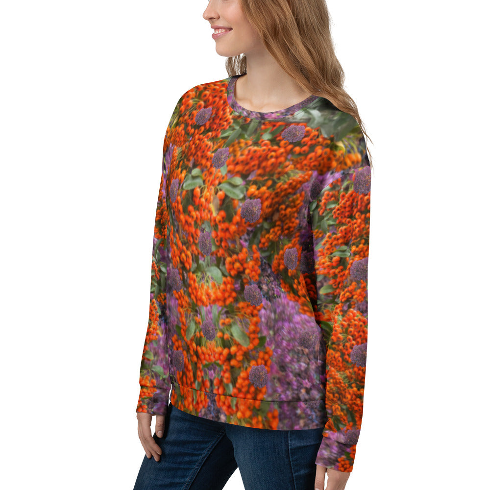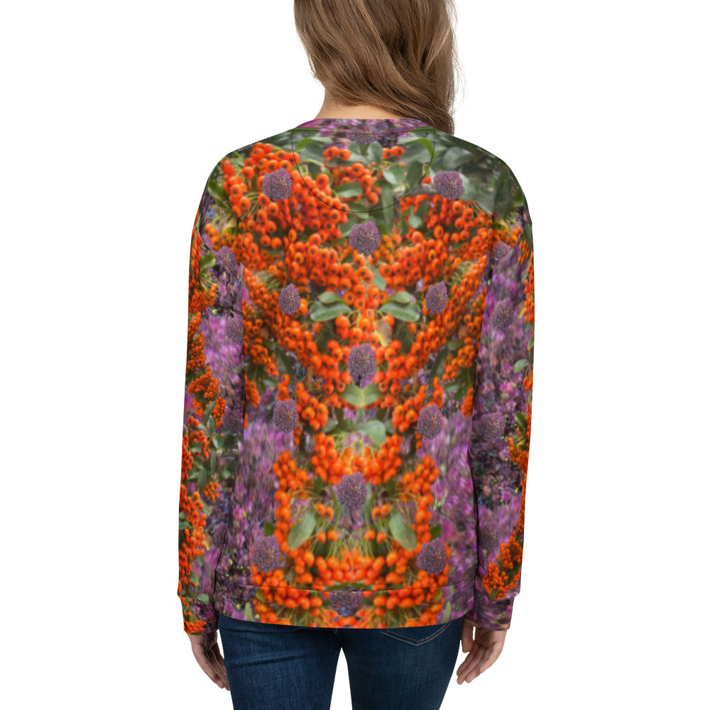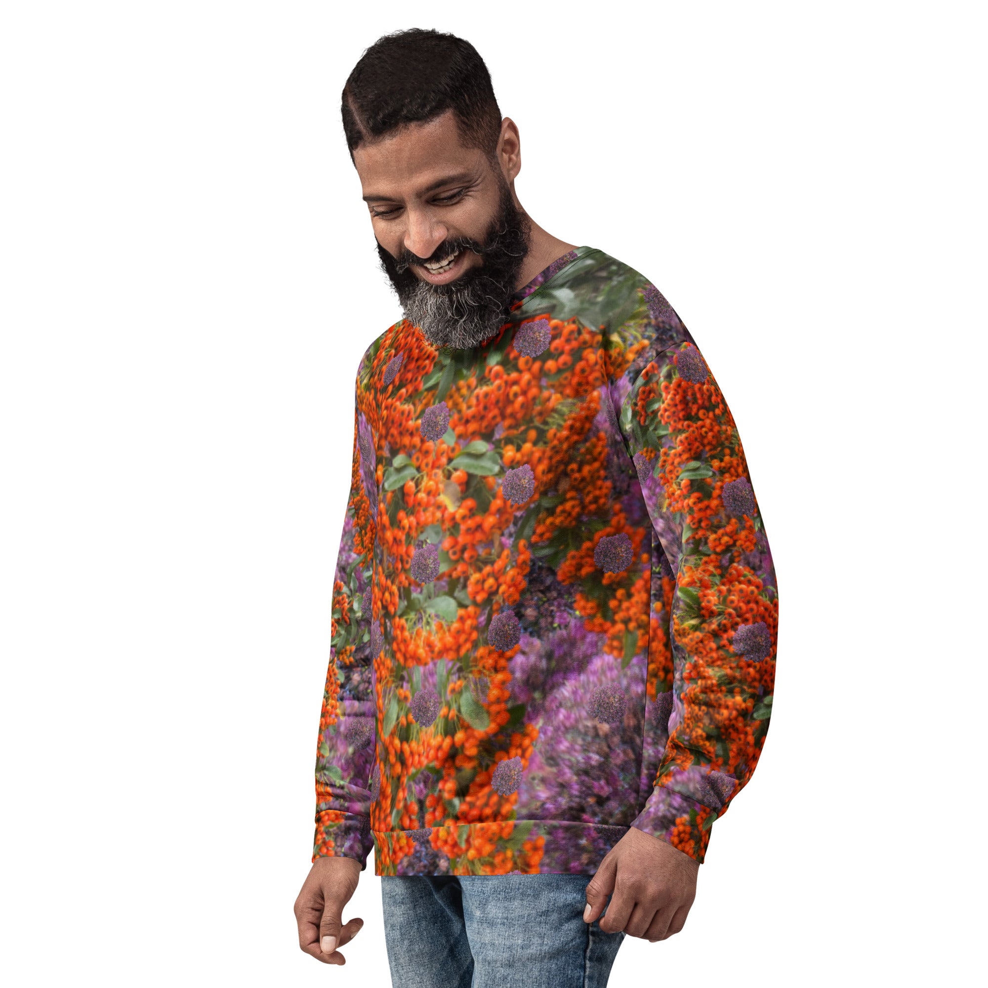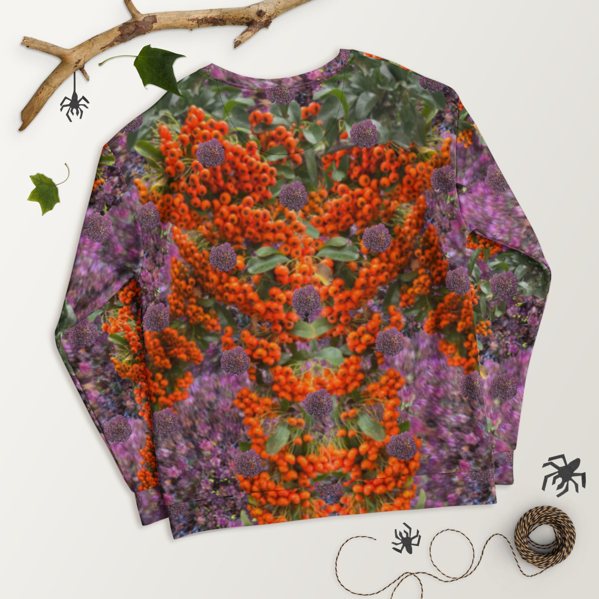 Carry the magic of a timeless English garden with you! This unique sweatshirt features the tenacious Orpine, known historically as Witches' Money Bags or Frogs Stomac ??—a symbol of longevity and prosperity. This vibrant pattern is set alight by the spirited Scarlett Fire Thorn or Everlasting Firebush ?, designed to ignite money and desire! (Image taken from the Shepperton, Surrey, UK garden).