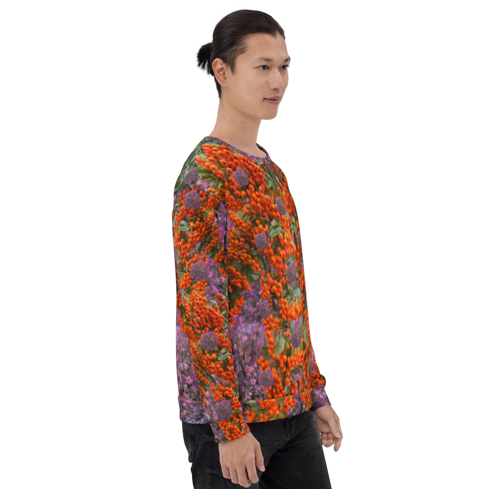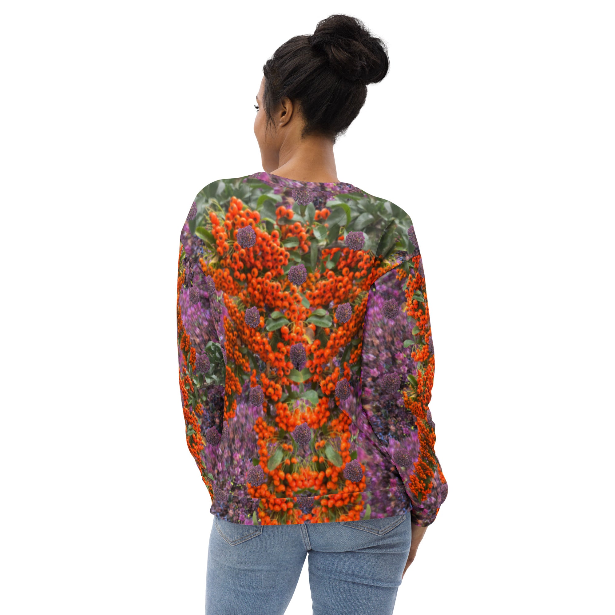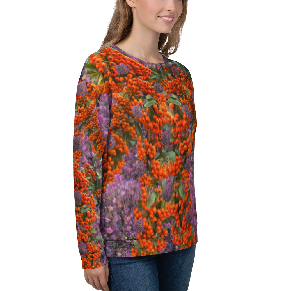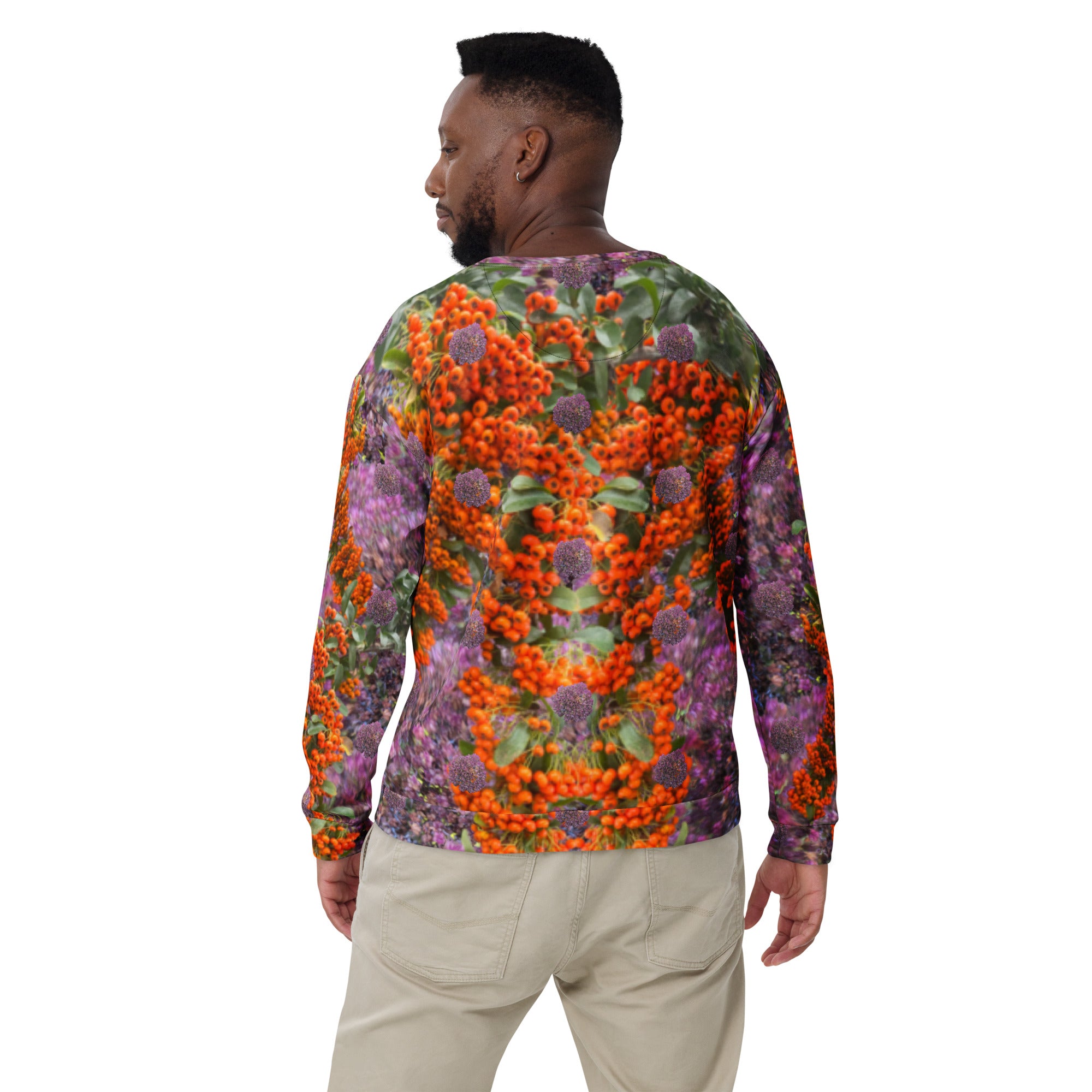 Carry the magic of a timeless English garden with you! This unique sweatshirt features the tenacious Orpine, known historically as Witches' Money Bags or Frogs Stomac ??—a symbol of longevity and prosperity. This vibrant pattern is set alight by the spirited Scarlett Fire Thorn or Everlasting Firebush ?, designed to ignite money and desire! (Image taken from the Shepperton, Surrey, UK garden).