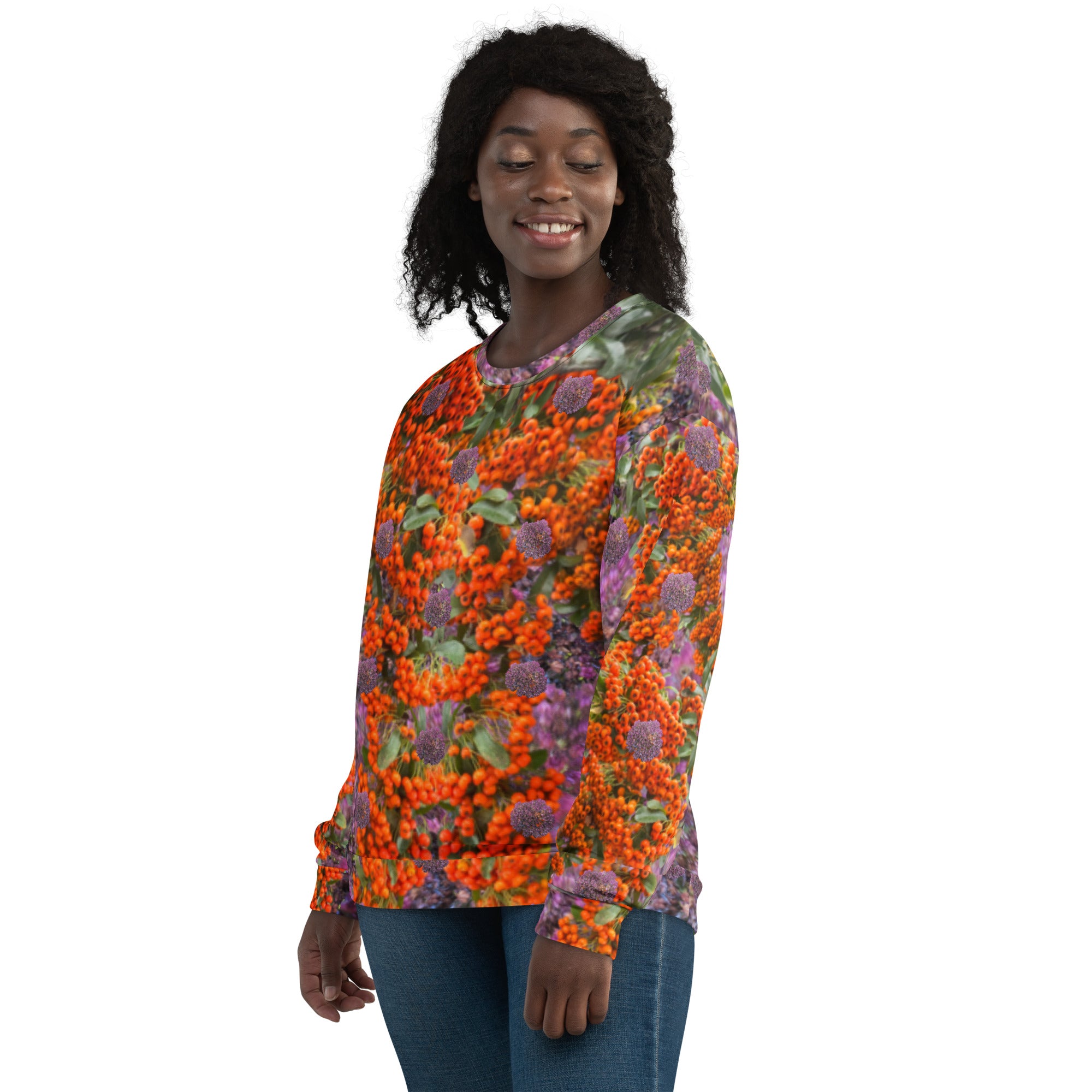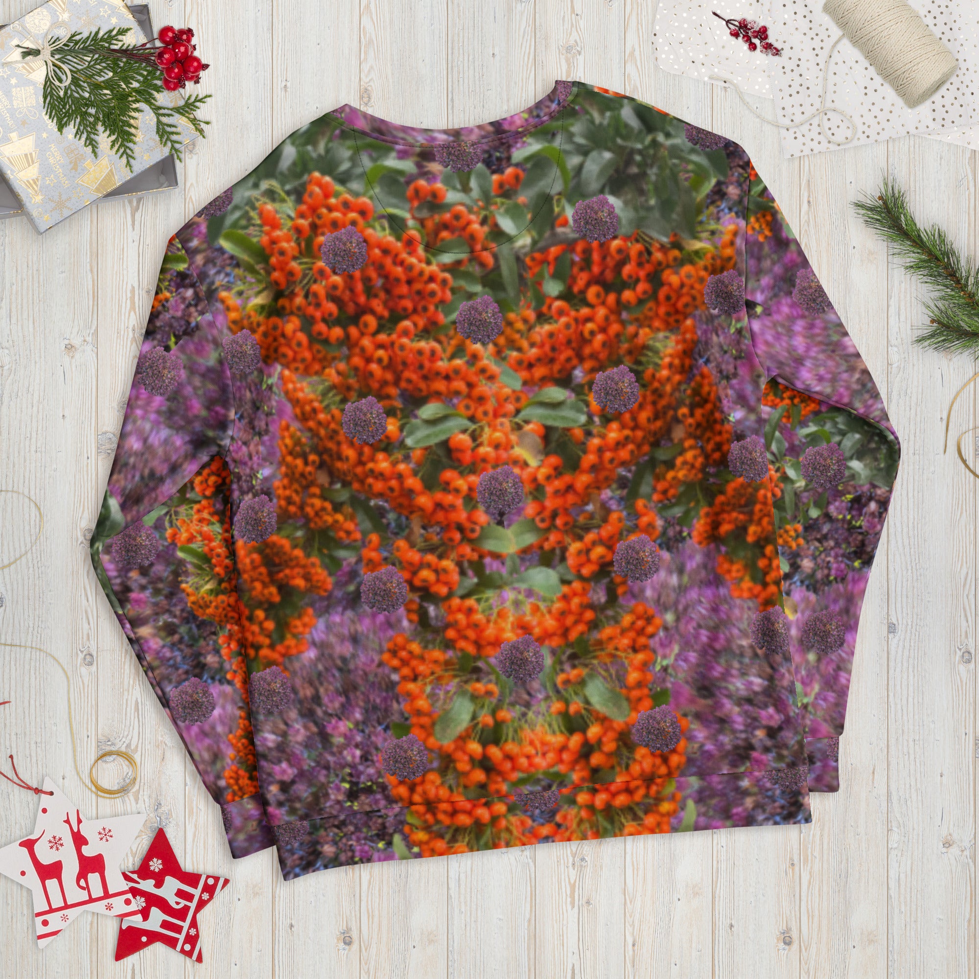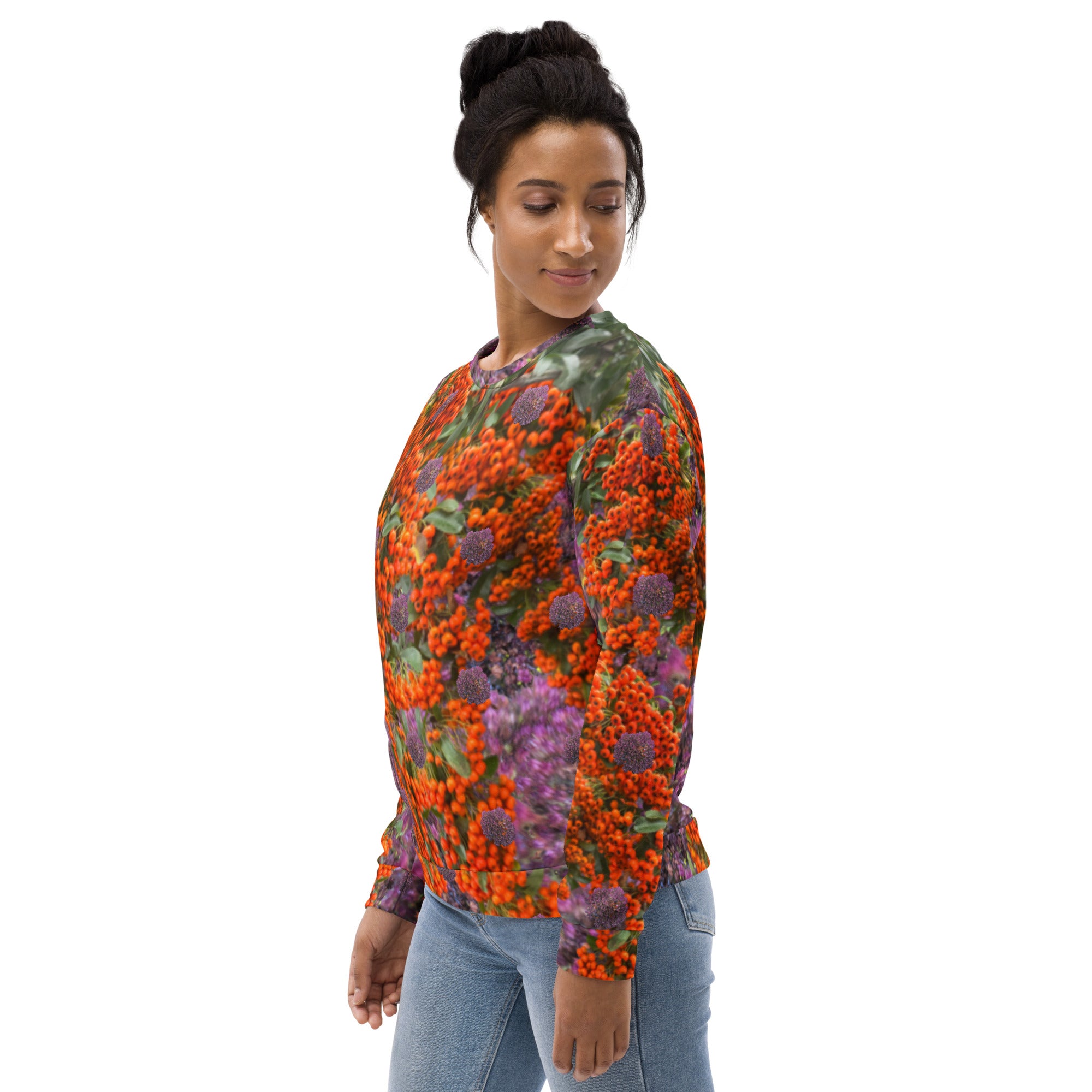 Carry the magic of a timeless English garden with you! This unique sweatshirt features the tenacious Orpine, known historically as Witches' Money Bags or Frogs Stomac ??—a symbol of longevity and prosperity. This vibrant pattern is set alight by the spirited Scarlett Fire Thorn or Everlasting Firebush ?, designed to ignite money and desire! (Image taken from the Shepperton, Surrey, UK garden).