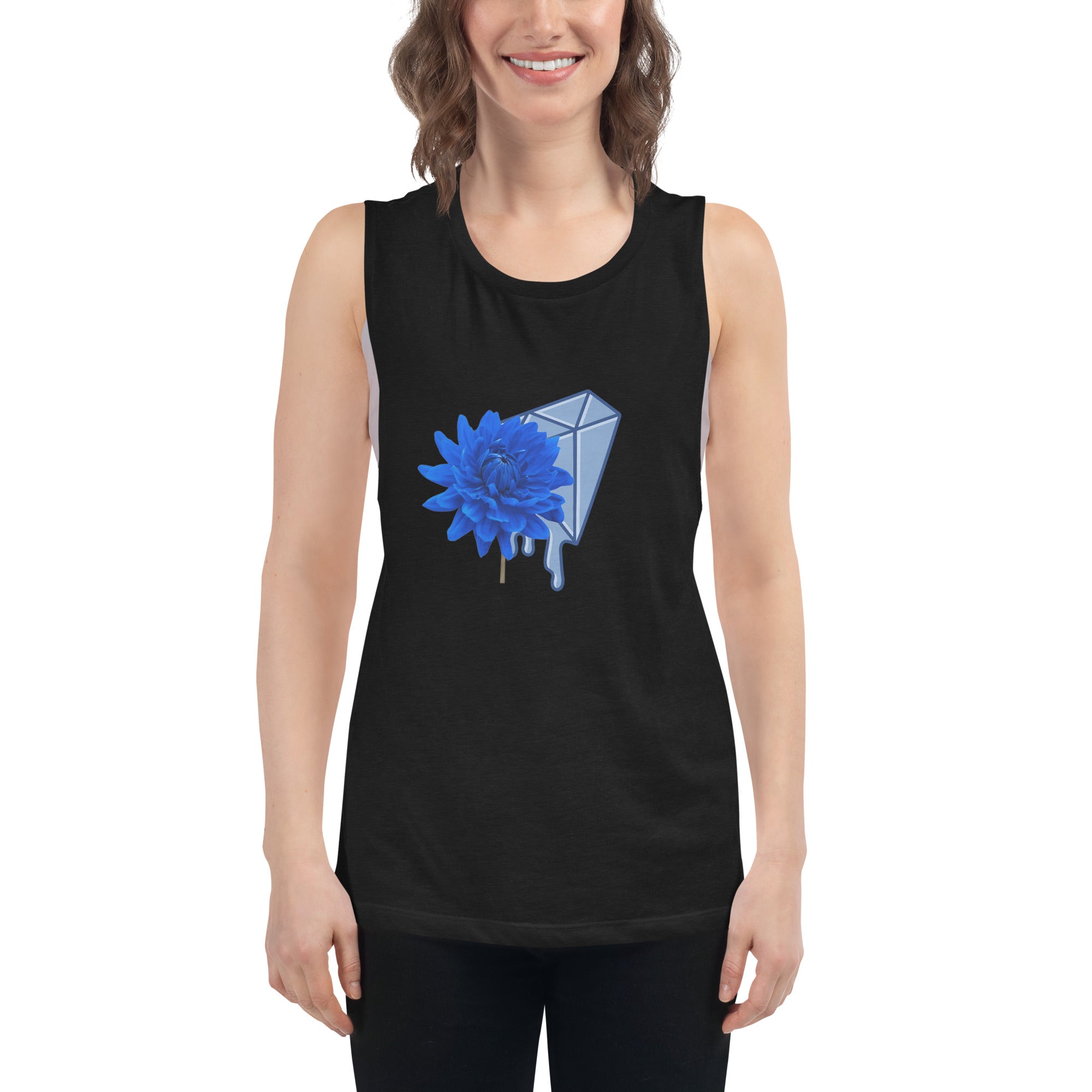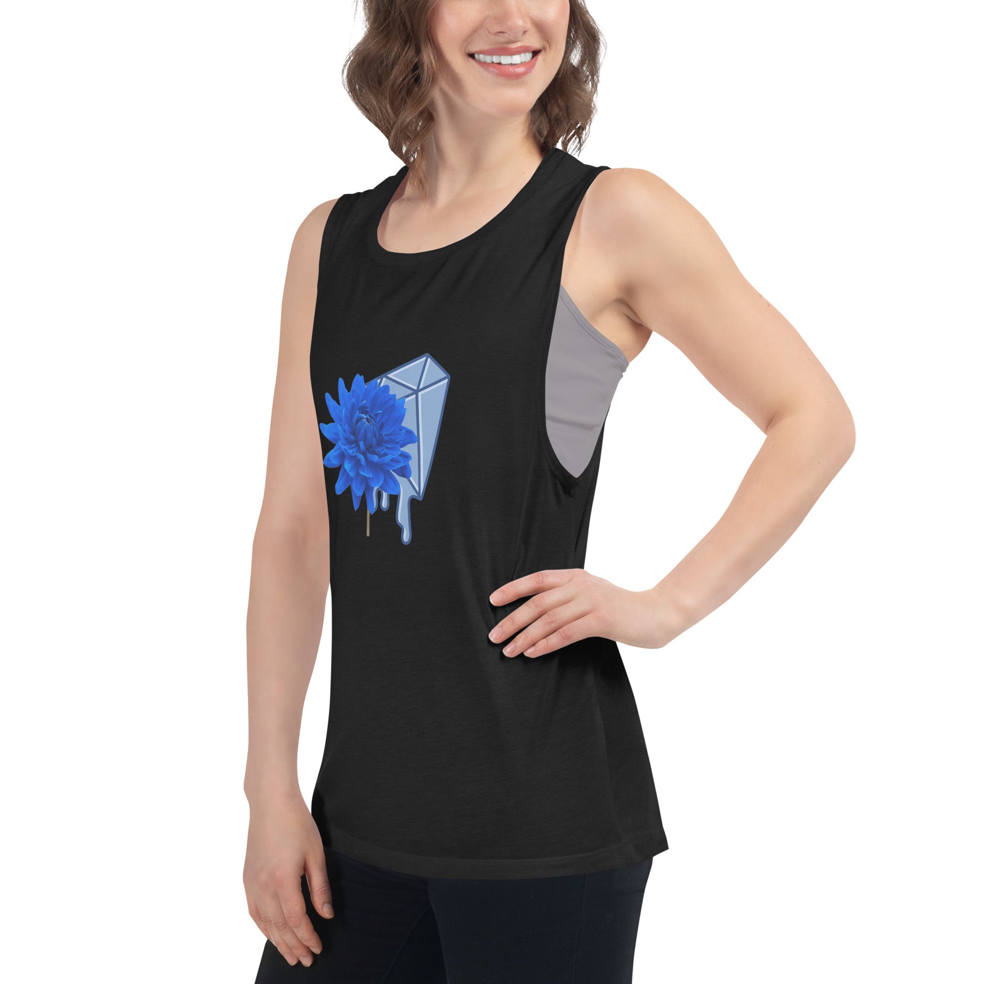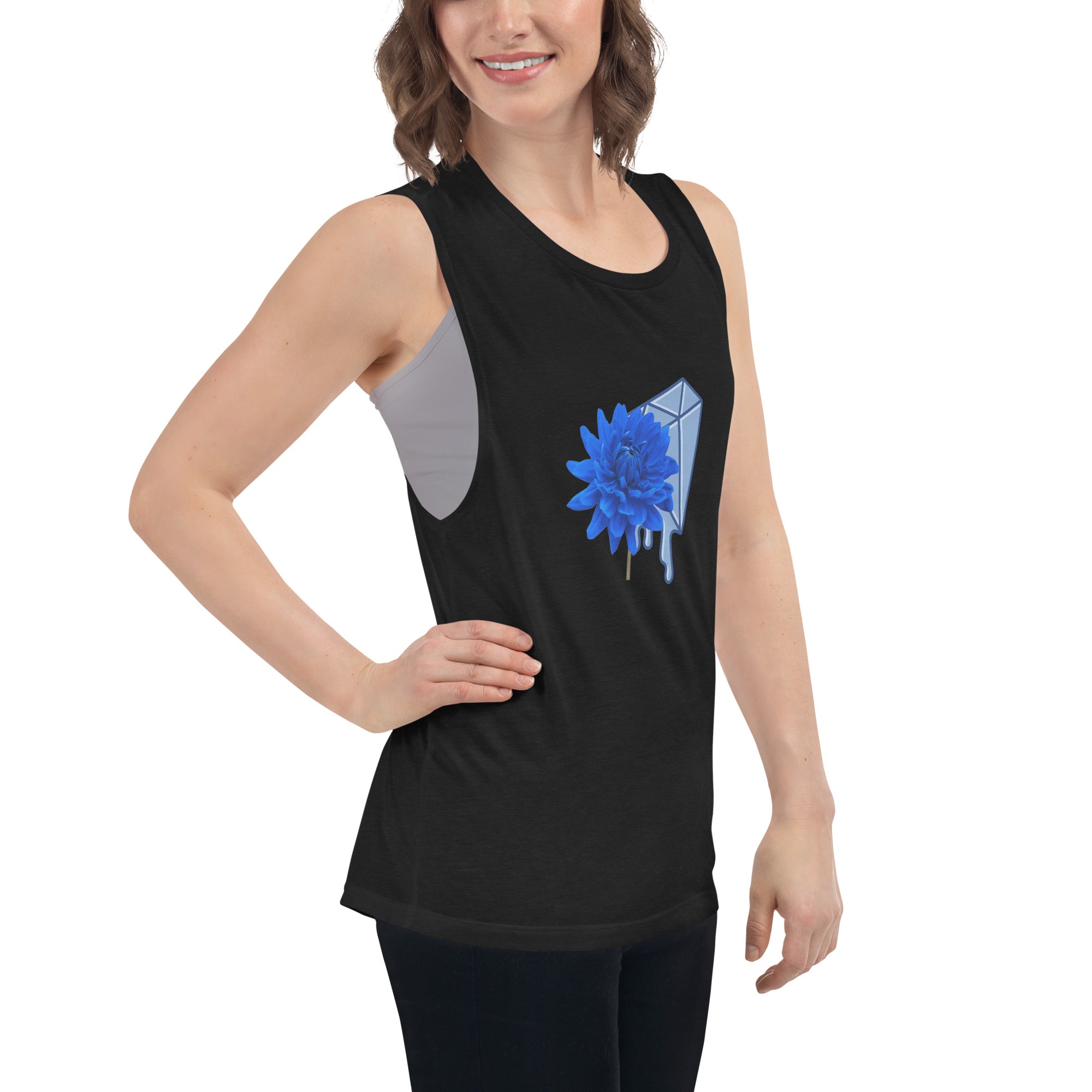 Where Comfort Meets Nature's Artistry: Blue Dahlia & Dripping Ice Tank. Discover effortless style and all-day comfort in this soft and flowy muscle tank. The low-cut armholes enhance its relaxed silhouette, while the captivating Blue Dahlia and Dripping Ice decoration infuse it with a natural elegance, making you feel connected to the beauty of the outdoors.