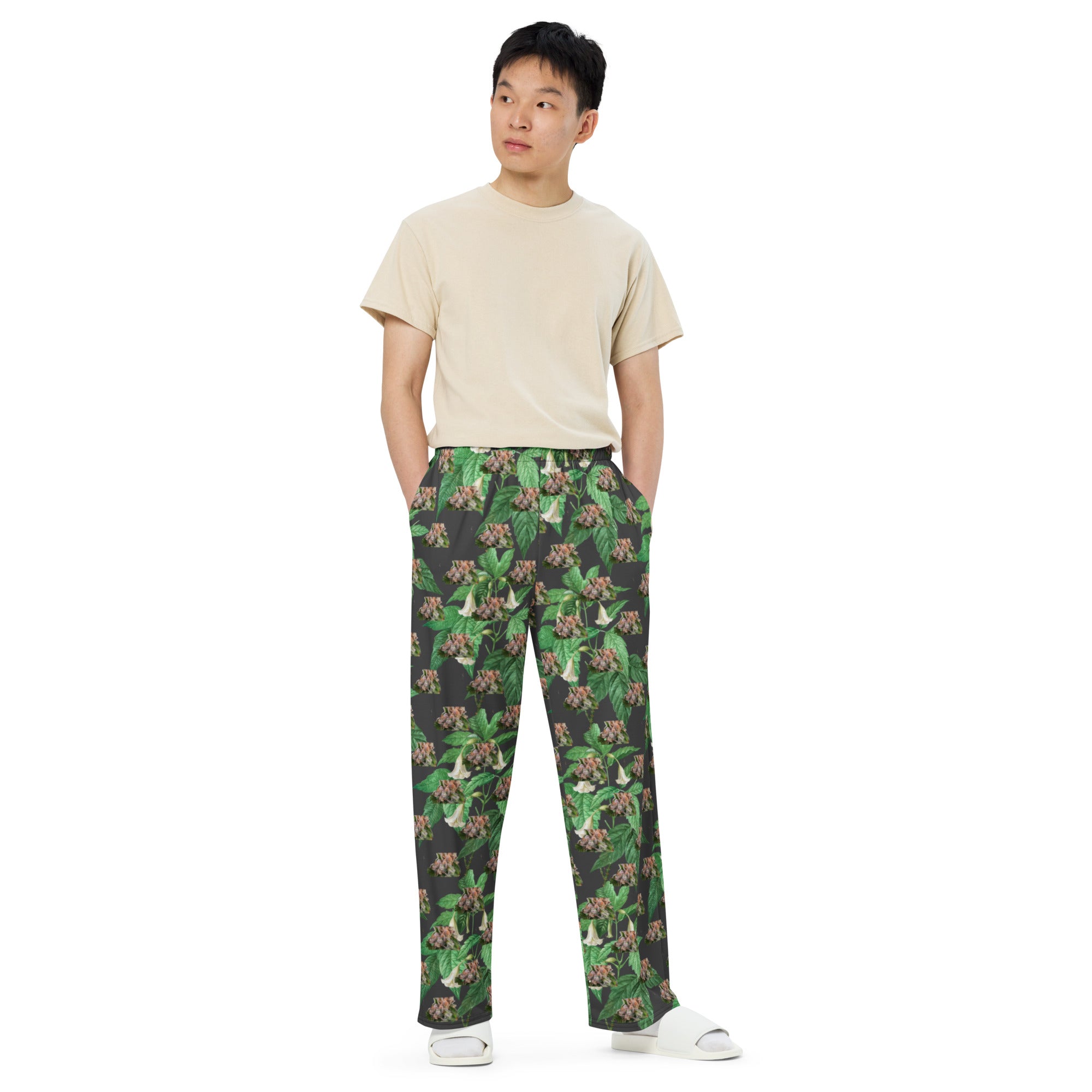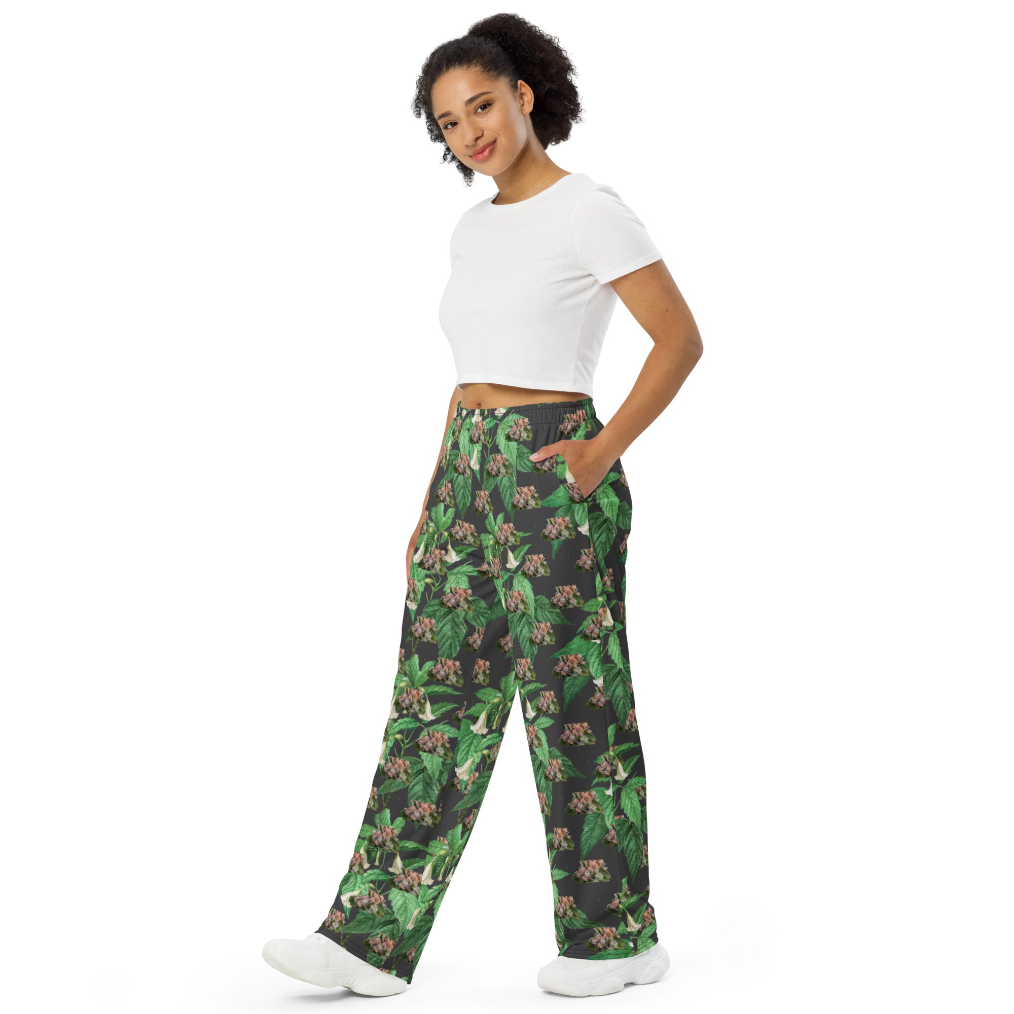 🌿 **Leafy-Bud Wide-Leg Pants - Cannabis Leaf & Bud Photography Fusion** 💚