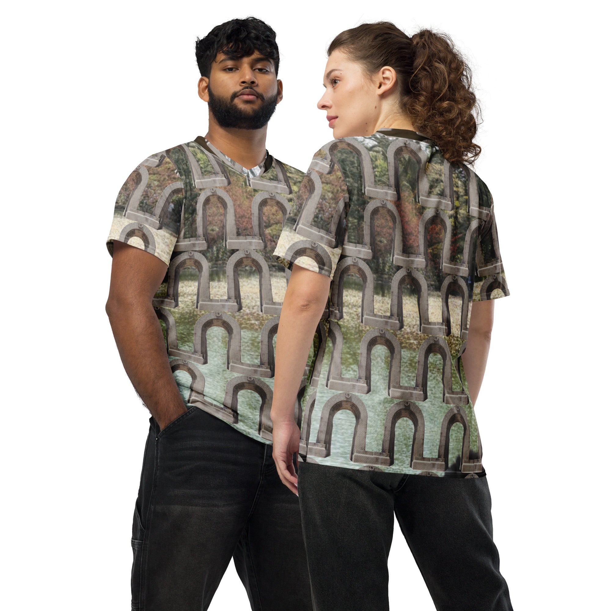 Experience the Beauty of Brooklyn's Green Oasis: The Recycled Garden Jersey. Imagine the peaceful ambiance of the Brooklyn Botanical Japanese Pond Garden with its striking columns, now captured in a vibrant design on this unisex sports jersey. Feel closer to nature with every wear, knowing it's crafted from 100% recycled polyester. This breathable, moisture-wicking top keeps you comfortable while you move, and the premium double-layered v-neck adds a touch of refinement. Embrace sustainable style and bring the beauty of the garden with you.