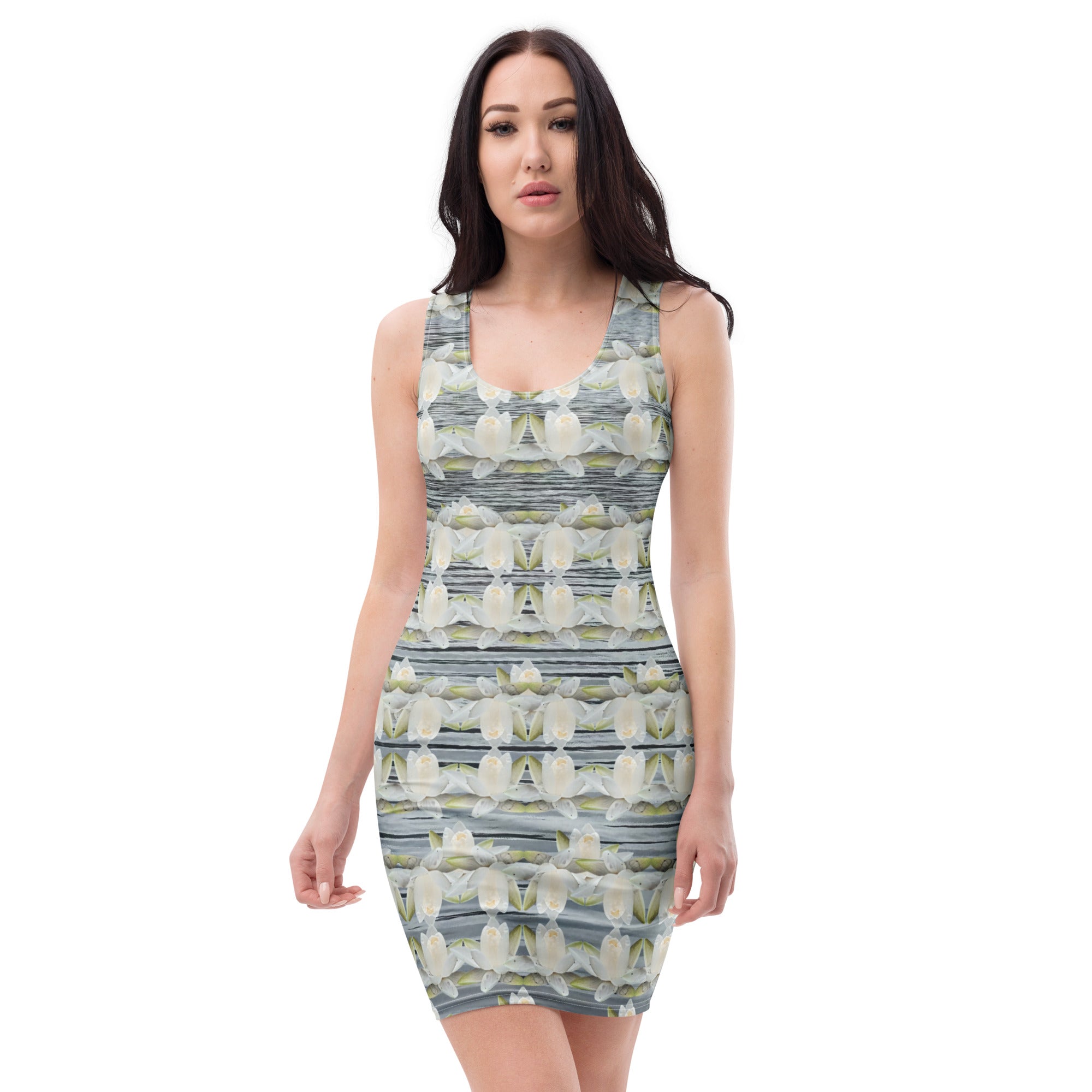 Capture the serenity and motion of nature in a stunning garment! This design features the tranquil image of water waves blended with photographs of real lilies captured during the magnificent 2025 bloom at the Brooklyn Botanical Garden in New York City. The result is a unique pattern that immortalizes the gentle wind making waves across the water.